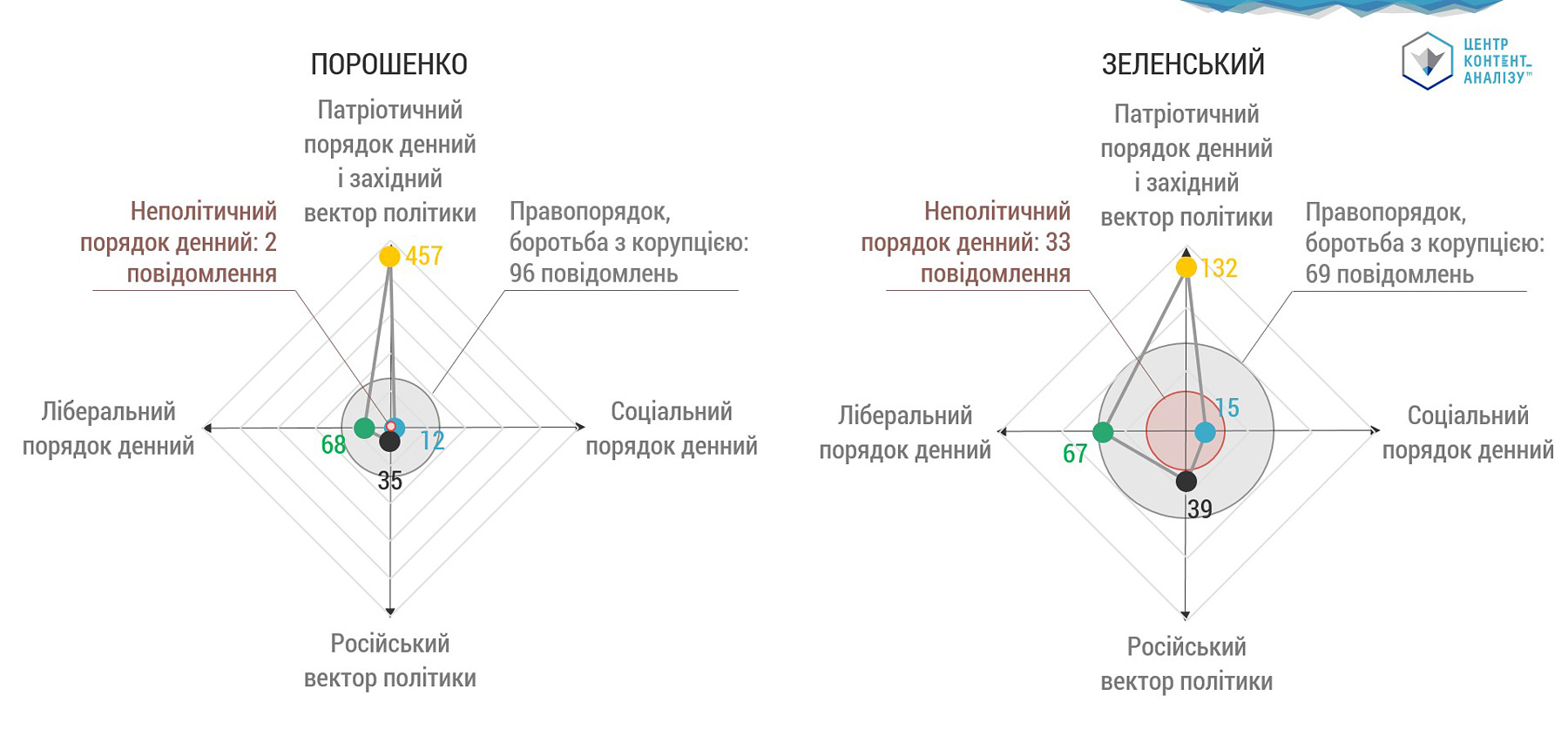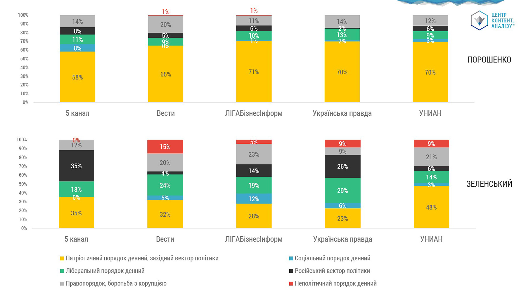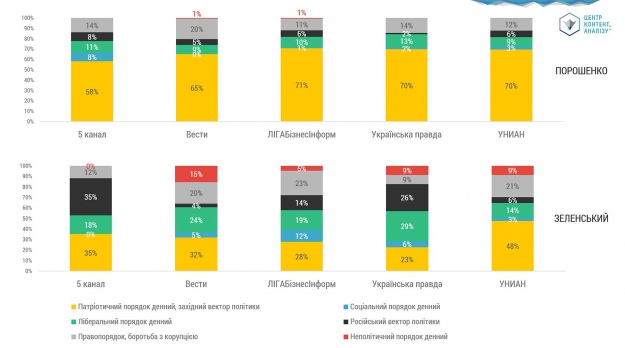- Різниця в подачі порядку денного окремими медіа дуже помітна у випадку Зеленського, але слабка у випадку Порошенка. П'ятий президент в умовах активної збройної агресії мав потужне висвітлення більшості своїх ініціатив, серед яких основний кістяк складали патріотичні.