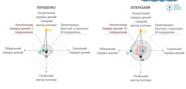 - Ще однією помітною відмінністю стала висока кількість неполітичного порядку денного в згадуваннях Зеленського.