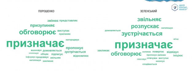Цікавими також були комунікативні дієслова: у Зеленського акцент був на процесі (зустрічається), у Порошенка – на змісті (пропонує, домовляється).