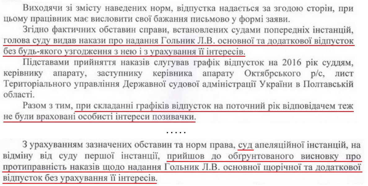 Струков "викрив" підступний задум: тривалий я час "відмовлялася йти у щорічні відпустки", а тепер постійно їх вимагаю, "маніпулятивно уникаючи своєю частою відсутністю на роботі від авторозподілу справ".