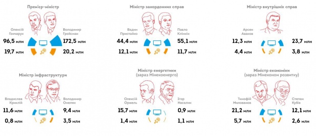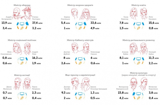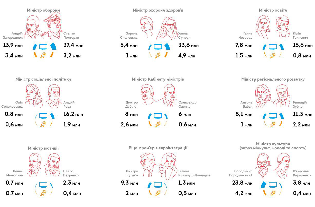 - Мінкульт. Варто зазначити, що на сьогодні Володимир Бородянський представляє об'єднане міністерство. Тому для порівняння з минулим Кабміном ми поєднали охоплення В'ячеслава Кириленка, Євгена Нищука та Ігоря Жданова, яке в сумі становить 16,3 млн із охопленням Володимира Бородянського – 28 млн. Різниця становить 1,7 раз.