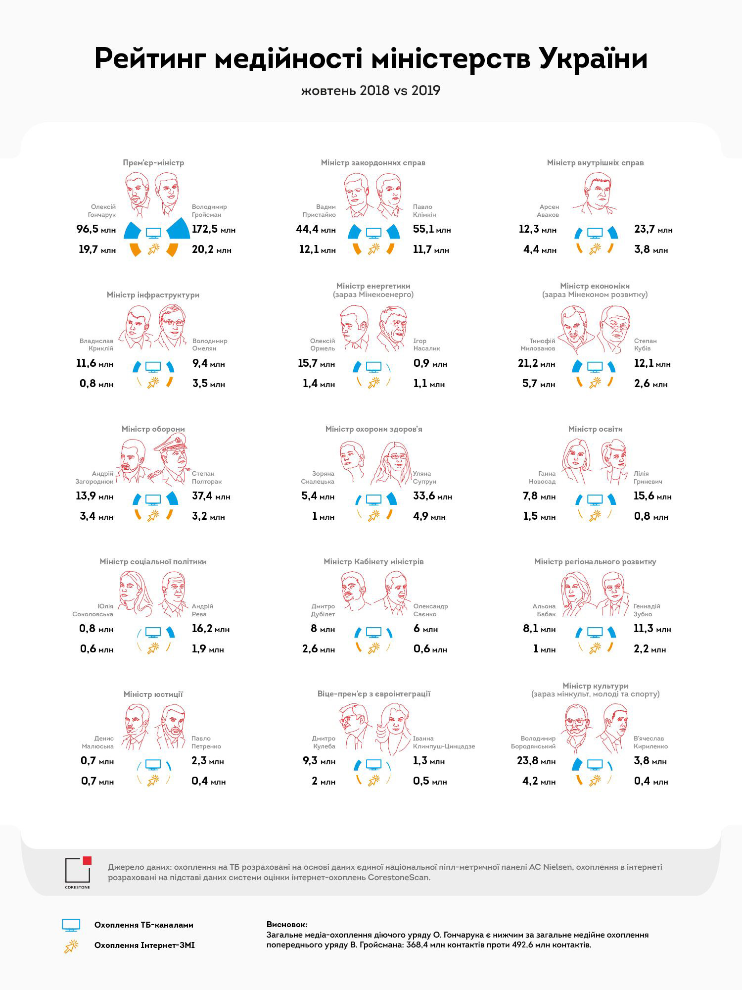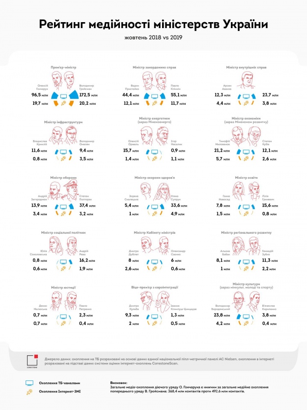 Водночас телевізійне медіа-охоплення Кабміну Гончарука у жовтні 2019 становило 301,5 млн контактів проти 431 млн контактів уряду Гройсмана у жовтні 2018.