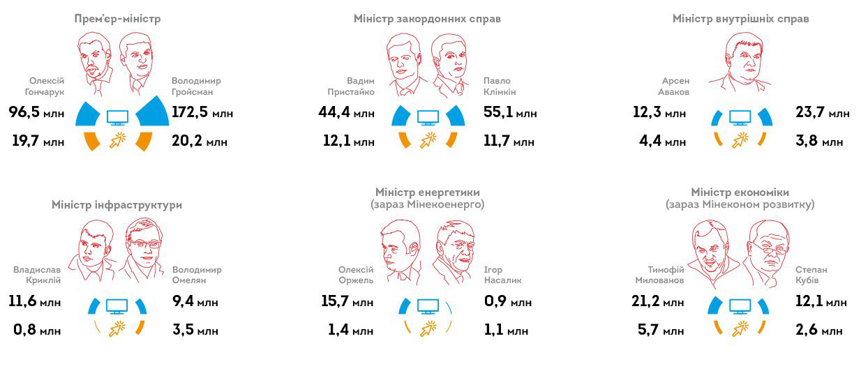 За жовтень 2019 інтернет-охоплення уряду Гончарука становило 66,9 млн контактів проти 61,6 млн контактів, які мав уряд Гройсмана у жовтні 2018 року.