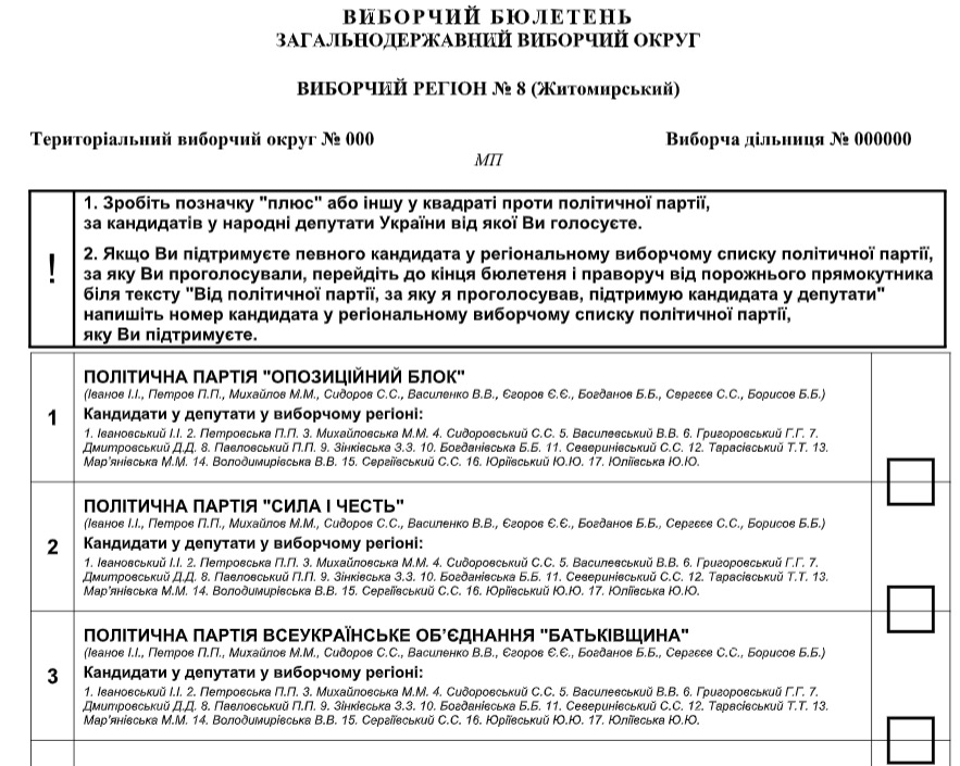 - якщо виборець не заповнить поле внизу бюлетеня, то цей голос пропорційно розподіляється між усіма кандидатами партії.