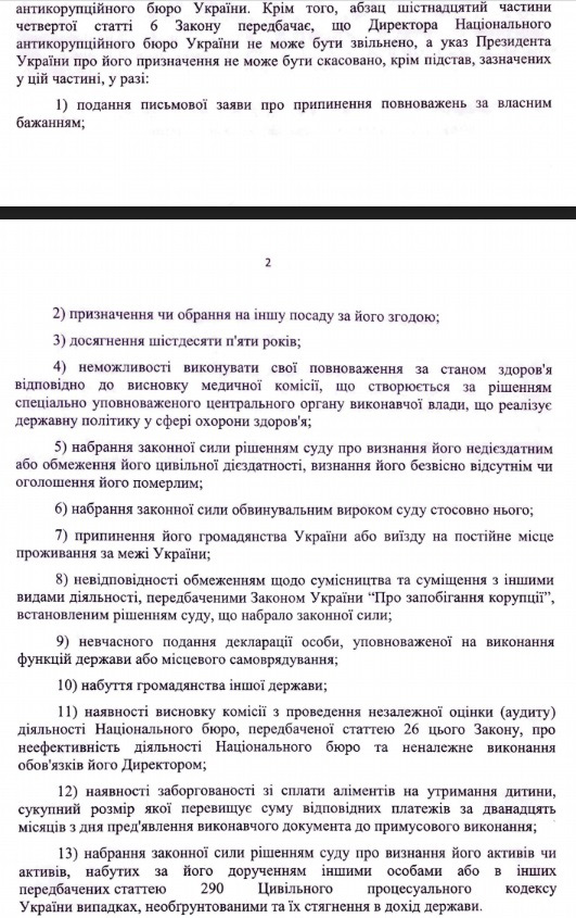 НАЗК, як і Мін'юст, посилається на статтю 6 закону про НАБУ, перелічуючи виключні підстави звільнення директора НАБУ.