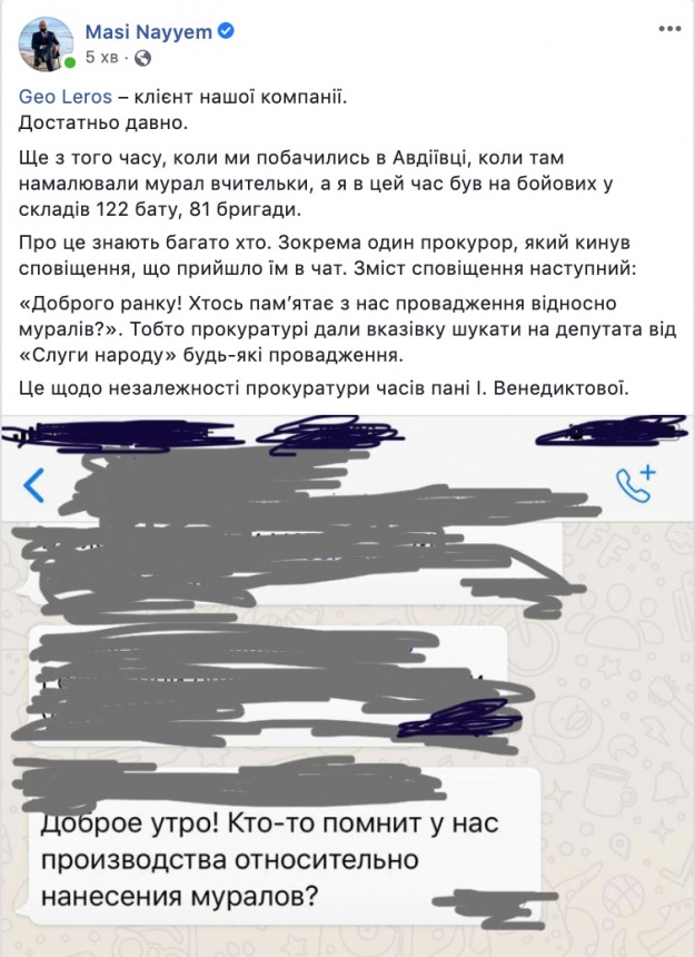Та і в прокурорських чатах вже шукають компромат на нардепа Лероса по нанесенню муралів у столиці. Про це заявив адвокат нардепа Масі Найєм.