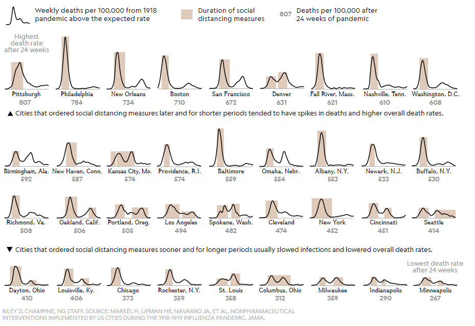 Показовою також була ситуація щодо кількості інфікованих та смертності від "іспанки" в містах з різними підходами до обмежень. Як повідомляє National Geographic, міста, які запроваджували non-pharmaceutical interventions на ранніх стадіях поширення вірусу, мали в середньому на 50 % нижчу кількість смертей.
