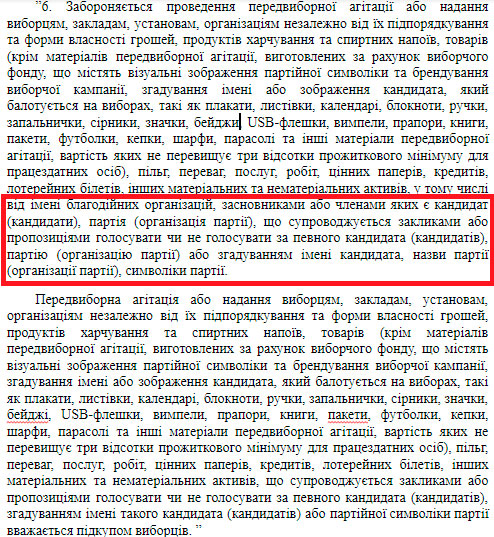 Проте, на нашу думку, запропоноване нардепами формулювання ч. 6 ст. 57 Виборчого кодексу створює законодавчу шпарину. У тексті йдеться лише про ті благодійні організації, засновниками або членами яких є кандидат чи партія, за яких агітують. Тобто БО, засновниками котрих не є політики/партії, залишаються поза увагою. А випадків, коли для підкупу використовували саме такі благодійні фонди, не бракує.