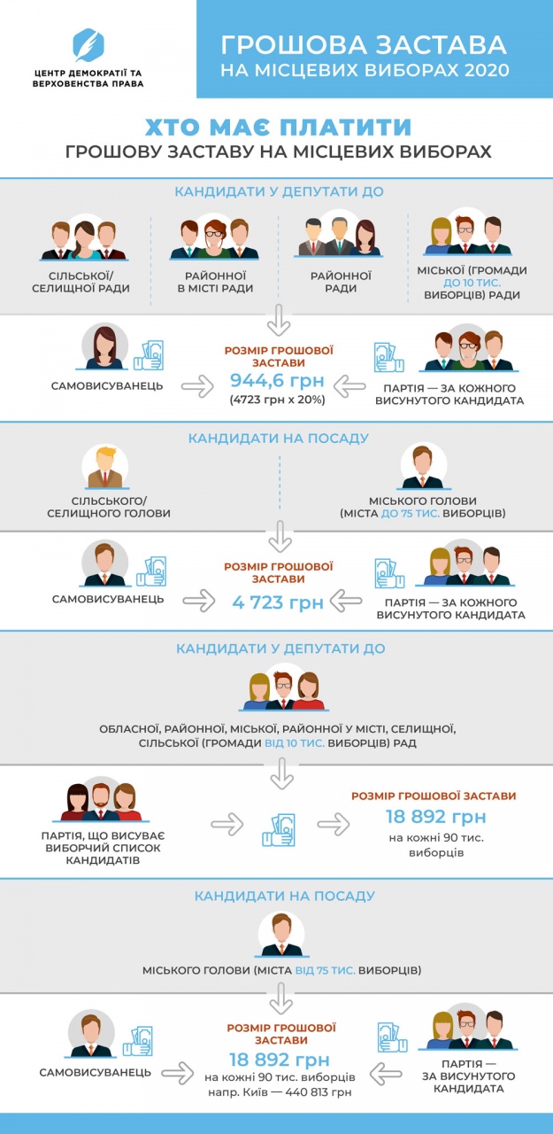 16 липня Верховна Рада України прийняла закон, який вносить зміни щодо грошової застави на місцевих виборах: її розмір зменшено, однак тепер грошову заставу на місцевих виборах платитимуть усі учасники виборчих перегонів.