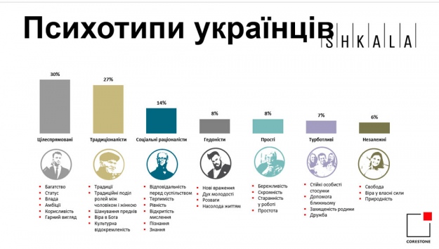 Треба копнути глибше і знайти не тільки те, що вже є, але й те, ким усі ці категорії українців бачать себе в майбутньому. Хоча ми всі різні, завдання якісної бренд-стратегії – відшукати те, з чим згідна більша частина людей. В основі цієї згоди лежить система цінностей.