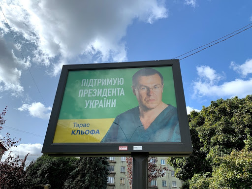 На білборді – кандидат на посаду мера Львова від "Слуги народу" Тарас Кльофа. Таку саму рекламу розмістив ще до реєстрації голова Львівської ОДА Максим Козицький, який очолив список "Слуги народу" до Львівської обласної ради.
