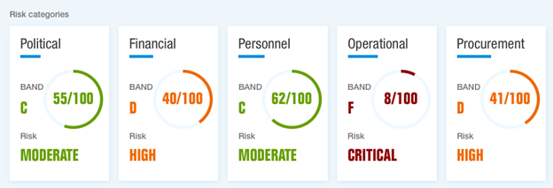 Кожну країну оцінюють за п'ятьма сферами ризику в секторі оборони, а саме: політичний, фінансовий, кадровий, ризик для військових операцій та закупівельний.
