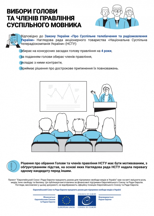 У Рекомендації CM/Rec(2012)1 Комітету Міністрів країнам-членам Ради Європи щодо управління суспільними медіа йдеться про те, що держава зазвичай не повинна робити призначення на рівні виконавчого або редакційного керівництва, а будь-які процеси призначення на посади таких органів мають бути розроблені таким чином, аби: