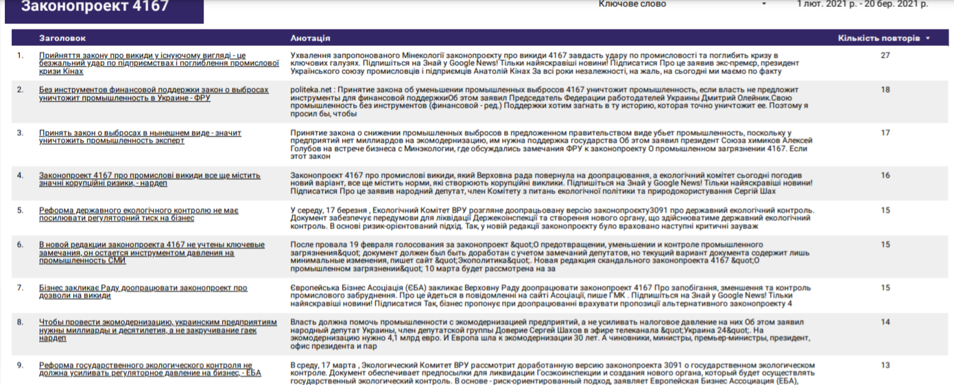 Актуалізована проблема промислового забруднення українськими підприємствами навіть у Європі за допомогою міжнародного аналітичного центру Ember. Після цієї інформаційної кампанії, до речі, лобісти замовили відмивання репутації у відомих PR-асів.