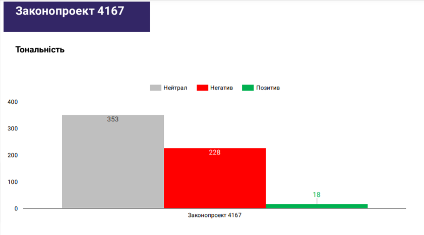 Негативні згадки про законопроєкт мали значну перевагу – 12 проти 1. Вони складали понад 65% публікацій. Нейтральні, як правило, забуваються швидко і майже не досягають аудиторії.