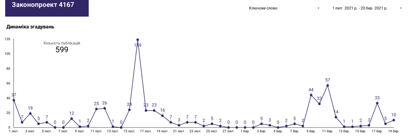Чітко видно сплеск однотипних публікацій в переддень першого голосування – ⅕ усіх публікацій. Меседжі лобістів "вимикають раціо" та жахають: законопроєкт – "безжалісний удар по підприємствах і поглиблення промислової кризи".