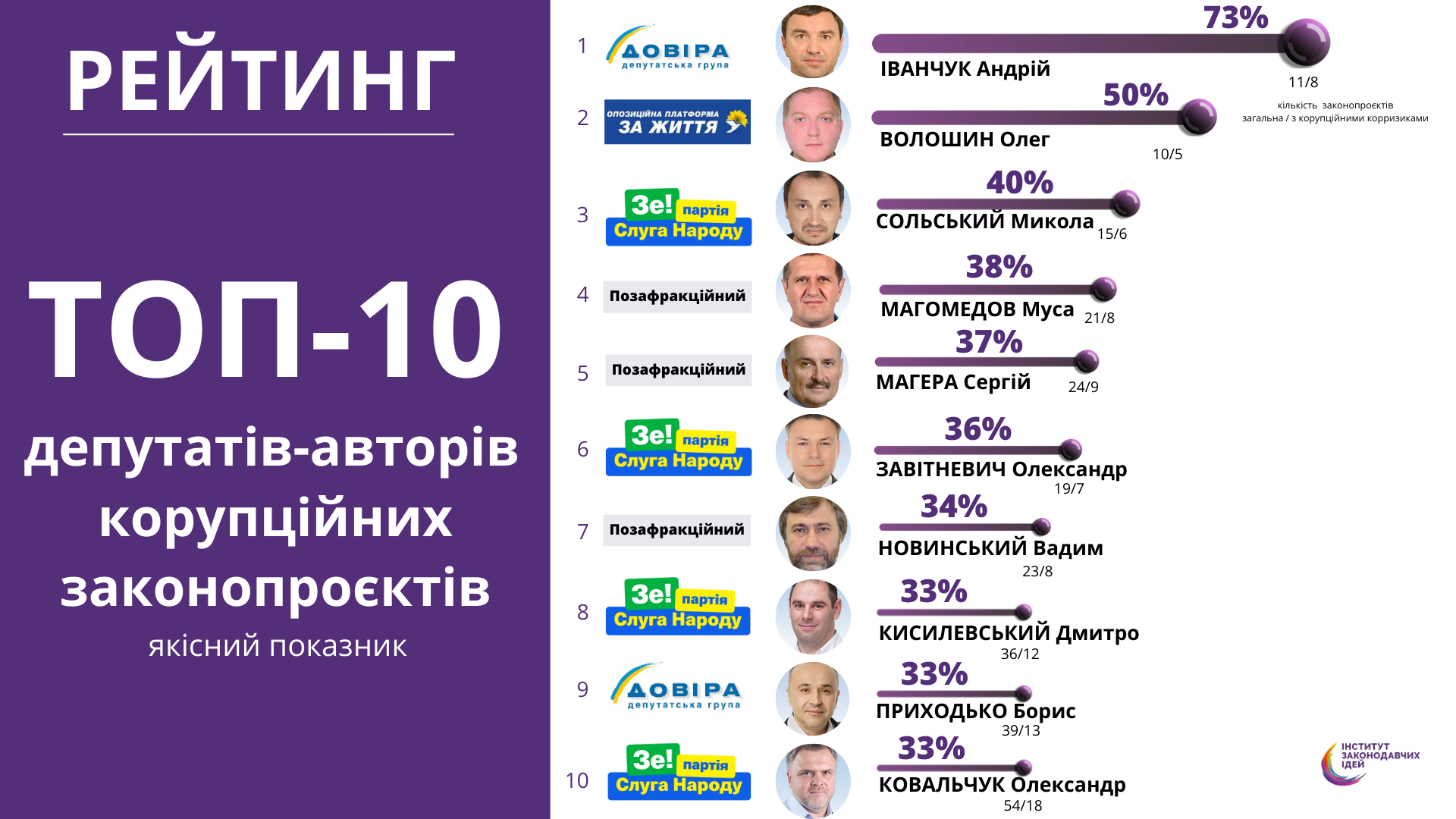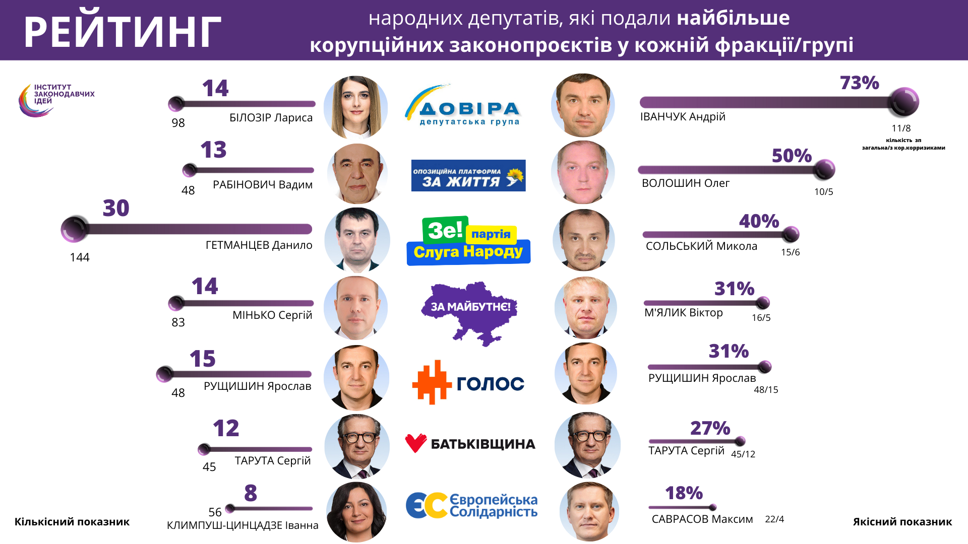 До рейтингу увійшли народні депутати, законопроєкти яких містять корупціогенні фактори за результатами проведення антикорупційної експертизи, яку здійснюють Інститут законодавчих ідей, Антикорупційний комітет ВРУ та НАЗК.