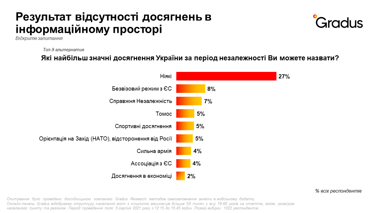 Третина респондентів вважає, що в України немає досягнень за період Незалежності. Ще третина не змогла відповісти на це запитання.