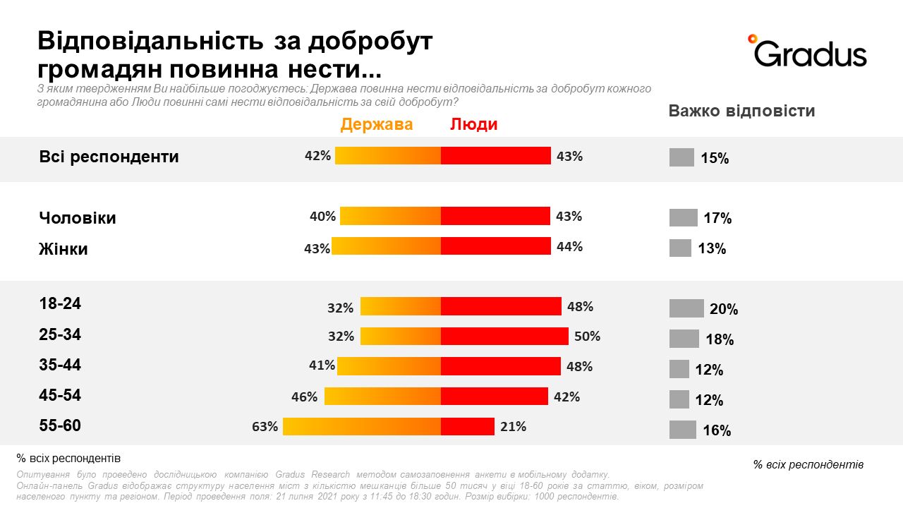 Частка респондентів, що вбачають добробут відповідальністю держави переконливо менша серед опитаних українців молодших вікових груп та зростає з віком.