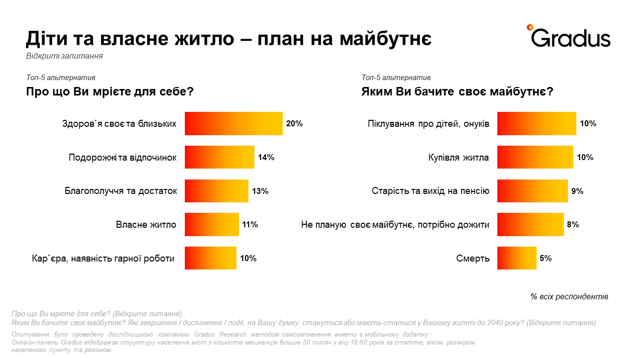 При тому, що мрії респондентів є більш особистими (здоров’я, подорожі, достаток), бачення свого реального майбутнього виражене переважно через піклування про дітей.