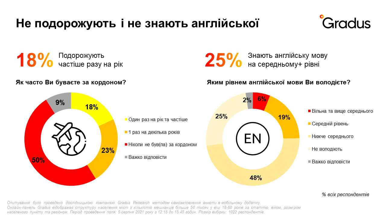 Половина міського населення України у віці 18-60 років ще ніколи не була за кордоном. Переважна більшість опитаних не подорожують і не знають англійської мови.