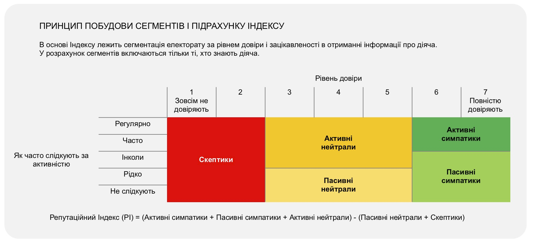 Другий показник нашого моніторингу, це репутаційний індекс. Він будується на підставі двох змінних – рівня довіри та інтересу до Персони. Всього виділяється три великих сегменти: скептики, симпатики і нейтральні.