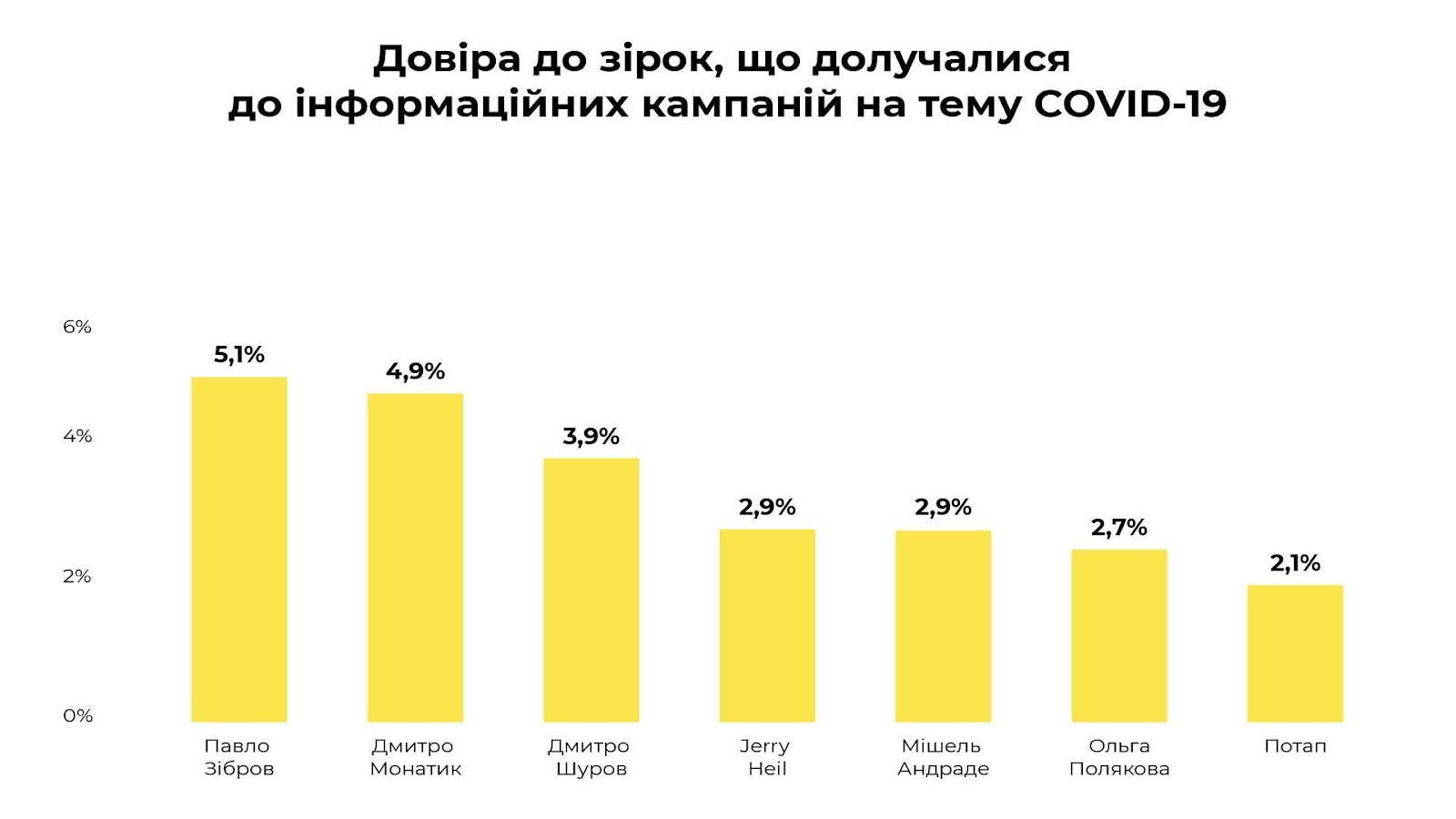 Тим не менш, серед артистів лідерами довіри українців стали Павло Зібров – 5,1% та Дмитро Монатик – 4,9%. Такая кількість респондентів оцінили їх як спікерів інформаційної кампанії з COVID-19 на максимальні 4 та 5 балів.