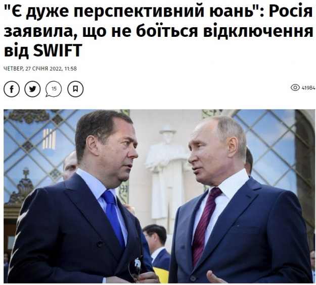 На запитання, які наслідки матиме відключення Росії від міжнародної системи здійснення банківських платежів SWIFT, Медведєв сказав, що не вірить "що нас хтось від цієї системи відключить, бо це не вигідно нікому".