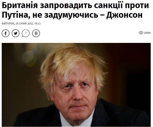 "Розвідка дуже чітко вказує на те, що на кордонах України є 60 російських бойових груп, план блискавичної війни, яка може захопити Київ, це те, що можуть побачити усі. Ми повинні чітко дати зрозуміти Кремлю, Росії, що це буде катастрофічний крок", – сказав Джонсон.