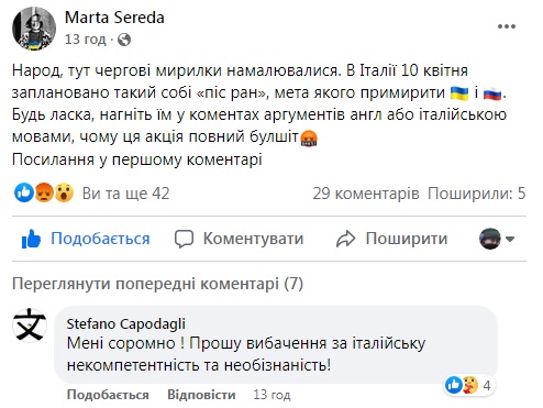 Хочете мирну акцію? Можна її організувати в Маріуполі біля розбомбленого драмтеатру, де був напис "Діти", а не в Італії. Насправді працювати на наративи ФСБ у ЗМІ і на вулицях з такими посилами – не варто.
