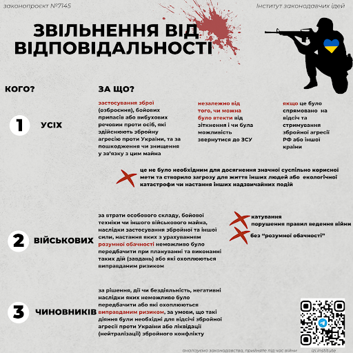 Виходить, що ми фактично маємо закон, який звільняє від будь-якої відповідальності за діяння вчинені під час війни. Але слід розуміти, що він не є загальною індульгенцією на вбивства та корупцію. Адже діє лише у випадку, якщо такі діяння були спрямовані на відсіч збройній агресії проти України або ліквідації (нейтралізації) збройного конфлікту.