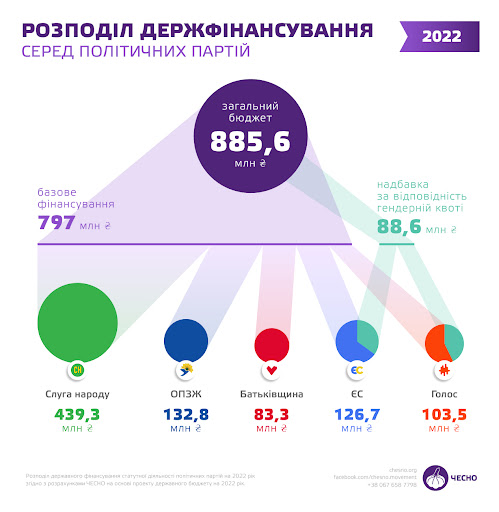 На фінансування партій у бюджеті передбачено рекордні 886 млн гривень. 90% цих коштів за законом розподіляються пропорційно до частки голосів, отриманих партією на останніх виборах до Верховної Ради. Відповідно, переможець виборів отримує найбільше коштів, а партія, яка заледве подолала прохідний бар’єр, – найменше.