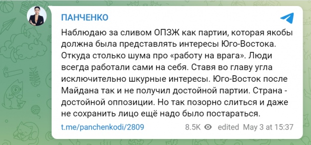 "Наблюдаю за сливом ОПЗЖ [...] Откуда столько шума про "работу на врага". Люди всегда работали сами на себя. Ставя во главу угла исключительно шкурные интересы. Юго-Восток после Майдана так и не получил достойной партии".