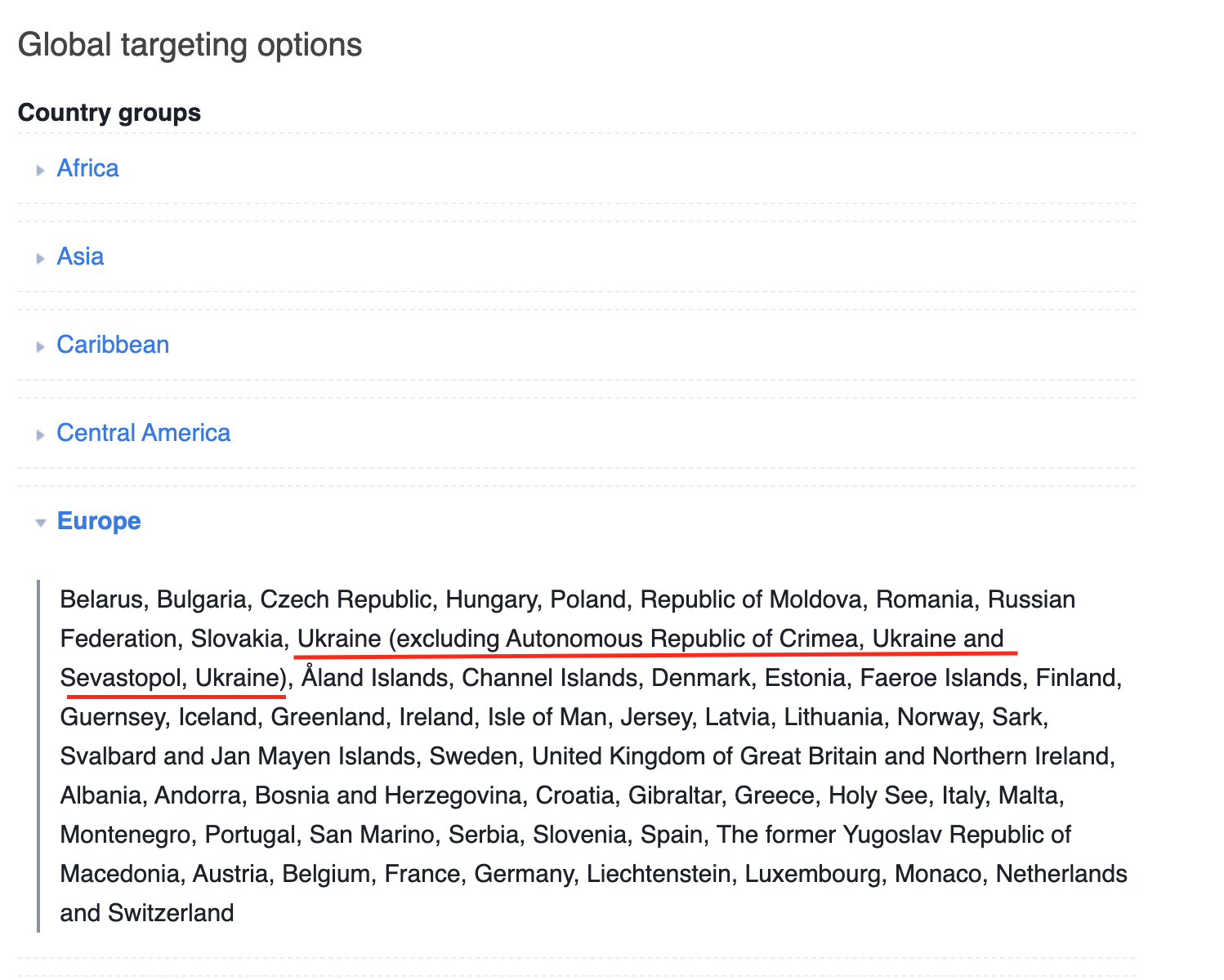 Однак, крім користувачів з АР Крим, із глобального таргетингу, схоже, також виключили окуповані території ОРДЛО.