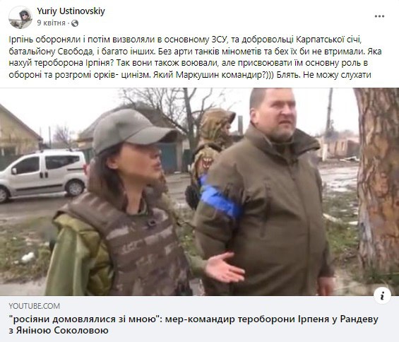 От і виходить, що захисники зелених зон захистили Ірпінь і пішли воювати на нульовій лінії фронту. Наприклад, Юрій Устіновський воює і зараз, тримав оборону в Ірпені та в Сєвєродонецьку. Він не може слухати те, що говорить Маркушин, зокрема, про його роль у захисті Ірпеня.