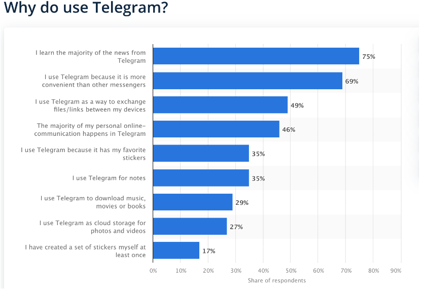 Глобальне дослідження Statista підтверджує такий тренд: загалом користувачі в цілому світі обирають Telegram насамперед як джерело споживання новин. Дещо менше, ніж цей фактор, їх приваблюють зручність месенджера, особиста комунікація та інші чинники.