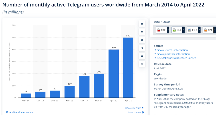 За останніми даними, опублікованими Телеграмом у червні 2022 року вже досягла 700 мільйонів.