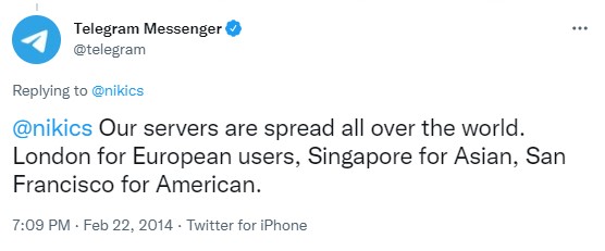 Також незалежно від того, де розташовані сервери, Telegram зберігає за собою право ділитися приватними даними користувачів з групою компаній Telegram, що працюють в ОАЕ та на Британських Віргінських островах.