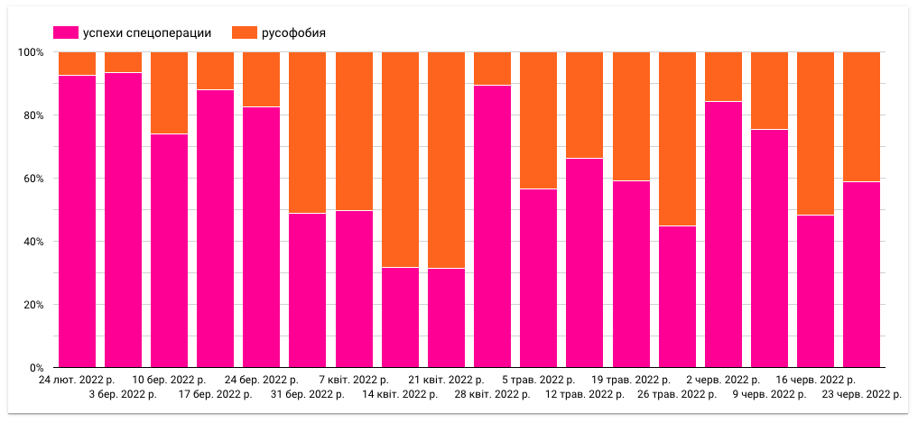 А ще публікації про "успіхи у спецоперації", які так масово створювались на початку війни, тепер значно поступаються за кількістю публікацій про тотальну зростаючу "русофобію".