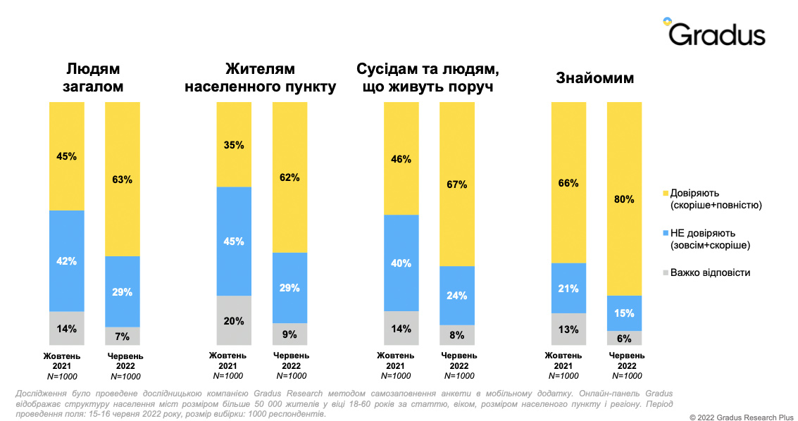 Вдвічі більше українців почали довіряти жителям свого населеного пункту (кількість таких зросла з 35% до 62%). Сусідам та людям, що живуть поруч, довіряють дві третини громадян (67%). А про довіру знайомим заявляють аж 80% опитаних.