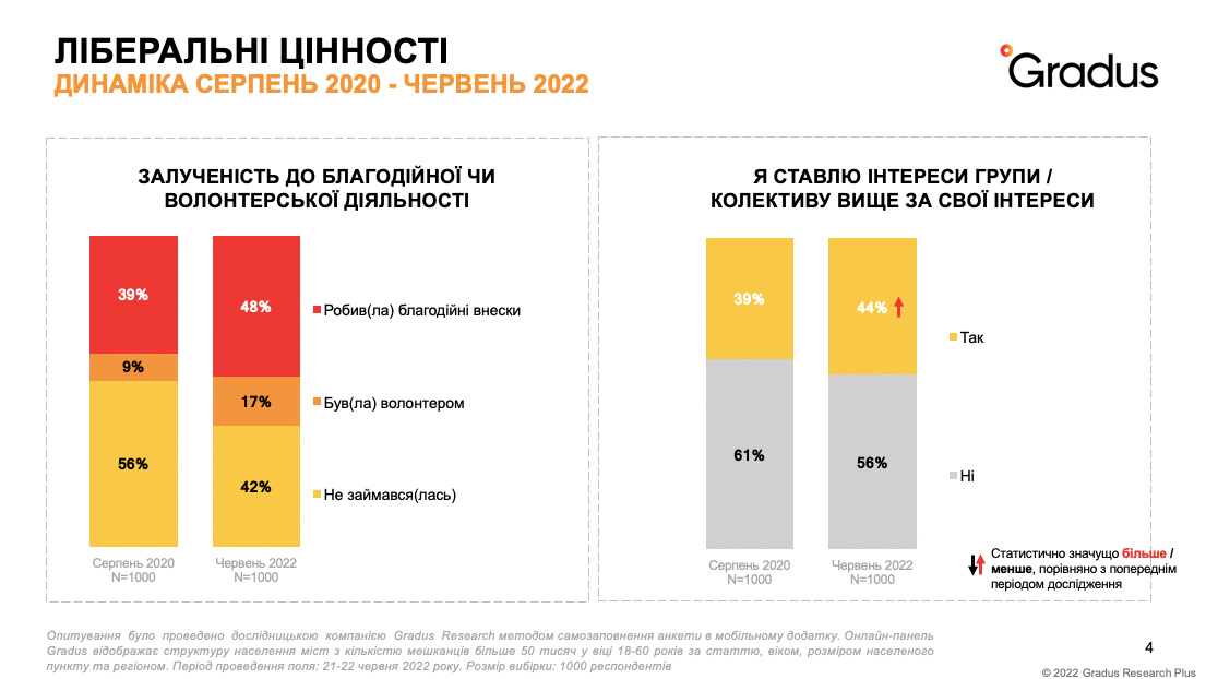 Опитування були проведені дослідницькою компанією Gradus Research методом самозаповнення анкети в мобільному додатку Gradus. Онлайн-панель Gradus відображає структуру населення міст з кількістю мешканців більше 50 тисяч у віці 18-60 років за статтю, віком, розміром населеного пункту та регіоном. Точні дати та обсяги вибірок проведення досліджень вказані на слайдах.