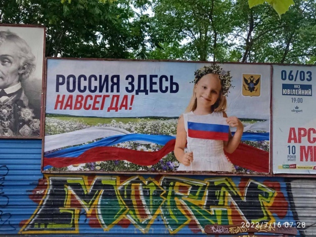 - засоби візуальної пропаганди. У населених пунктах рекламні площі зайняті бордами з цитатами Путіна та гаслами "Россия здесь навсегда" и "Мы один народ";