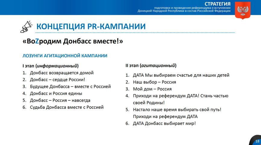 Російська пропаганда працює над створенням ілюзії масової підтримки ідей приєднання до РФ на окупованих територіях, а також активно працює з місцевим населенням. Для вирішення першого завдання організовувалися "народні сходи" та пікети.