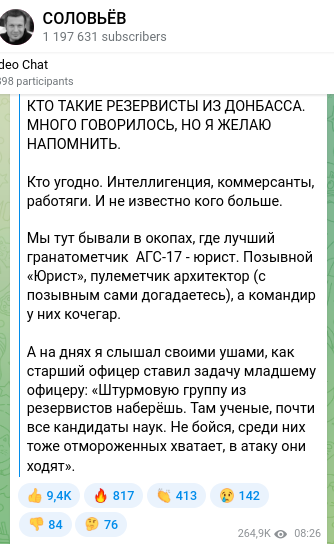 "А днями я чув на власні вуха, як старший офіцер ставив завдання молодшому офіцеру: "Штурмову групу з резервістів набереш. Там вчені, майже всі кандидати наук. Не бійся, серед них теж відморожених вистачає, в атаку вони ходять".