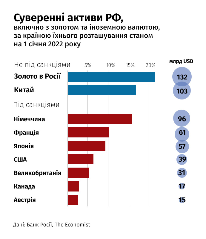 Йдеться про активи, які належать безпосередньо росії як державі, а не окремим її громадянам. Так, сума активів Центрального банку росії, заморожених на рахунках у США, становить приблизно 38 мільярдів доларів США із приблизно 330 мільярдів, заморожених за кордоном у цілому. Так, на долю США припадає близько 1/10 заморожених суверенних активів рф.