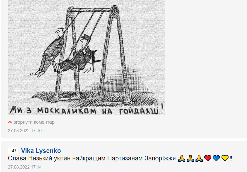 А колаборантам і зрадникам в очікуванні нашого підпілля бажаємо інтенсивно слухати пісню ДДТ "Последняя осєнь" і обирати між вогнепальною зброєю і вибухівкою.