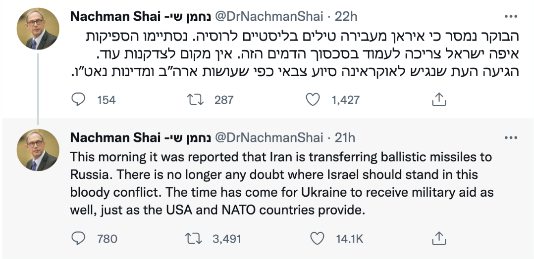 "Сьогодні вранці стало відомо, що Іран передає Росії балістичні ракети. Більше немає сумнівів у тому, яку позицію має зайняти Ізраїль у цьому кривавому конфлікті"