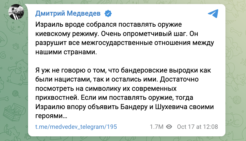 Дмитро Медведєв відреагував одразу ж у своєму стилі: почав залякувати Ізраїль, що допомога Києву зруйнує відносини з Росією.