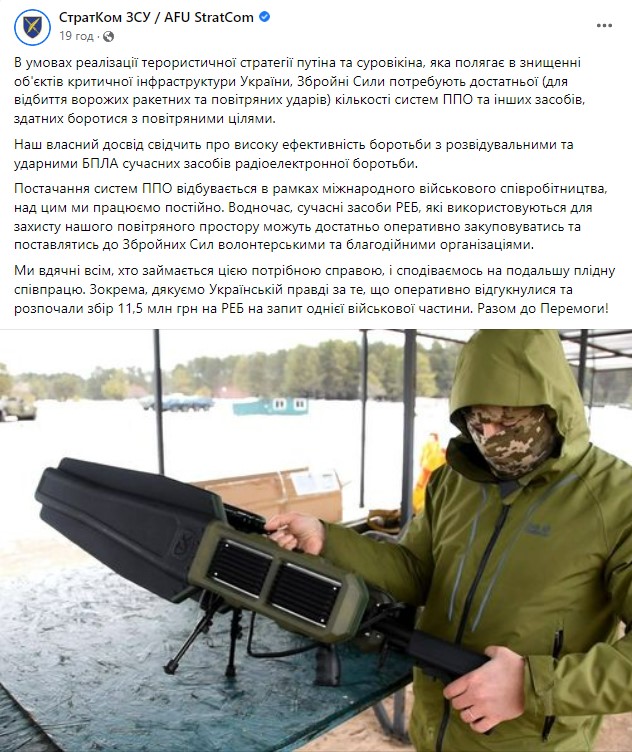 У листопаді до нас звернулися військові з проханням допомогти зібрати 11,5 млн гривень на покращення системи ППО. Мова у запиті йшлася про закупівлю додаткового обладнання – комплексу радіоелектронної боротьби та апаратного комплексу імітування сигналів.