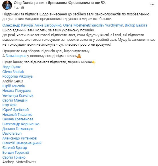 До слова, за словами Олега Дунди, який збирає підписи під зверненням, Шуляк не поставила свій підпис. І це зрозуміло: без фігурантів Реєстру держзрадників скандальний проєкт, який не врахував всі антикорупційні зауваження НАЗК, не протягнули б через сесійну залу.